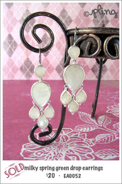 *SOLD* Dressy or casual? You decide. Looking great either way, these danglies hint of the lightness of green in the meadows on a clear day. Pearlized, these drops reflect the milkiness of your skin.