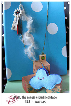 L 28cm • Felt Cloud pendant 4.5cm • Embroidered flower pendant 6cm • Wooden tree charm 1.5cm • Adjustable length (with tiny wishing star charm on extension chain) • Dark gold color