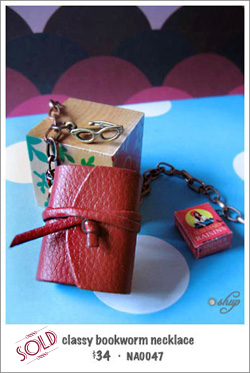 *SOLD* This special leather book necklace is for that sexy librarian in you! Pair it with your black-rimmed glasses, a French chignon, a tweed pencil skirt, close-toed heeled pumps and you’re set to sizzle up every aisle in the library! And for the cheeky little girl in you, stealing a taste from a box of retro Sun-Maid raisins when the librarian is not looking always makes studying much more fun! The book has real blank off-white pages in them, all the better to pass secret notes in class!