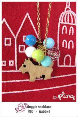 Wooden doggie pendant with blue/green/white/clear beads on gold chain.