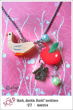*SOLD* Thanksgiving is over! You look out of the window into the barn and heave a sigh of relief. Your duckie friend is back to its happy waddling in the yard! Keep it near to your heart always with this deliciously innocent necklace – a scrumptious mix of wood, felt, shining beads and a little brass birdhouse. Perhaps it harbors a secret wish to be able to fly, high! But put out his favorite apple in the birdhouse and he’ll be back in a sec. Friends forever!