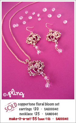Hot and stylish, wear these for an instant drama! The copper tone floral earrings descend to dangle 2 clear beads that twinkle as you move your head. If you have copper or burgundy colored hair, wear these with your hair tucked behind your ears or tied up. They look wonderfully antique against black hair. Don the necklace with warm colored clothing or your basic blacks or whites.