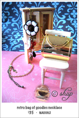 L 34cm • Gold hardcased bag pendant W 4cm • Beige daisy, white lace flowers, scalloped suede and black bead/leaf charm dangle L 8cm • Adjustable length • Gold color link chain