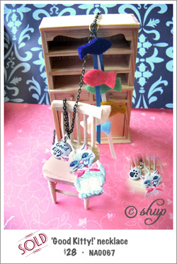 L 39cm • Vintage patch kitten pendant with gray felt backing 4.5cm • ‘Good Kitty’ charm with paw-print at the back 2cm • Felt fish dangle 12cm • Adjustable length • Dark gold link chain