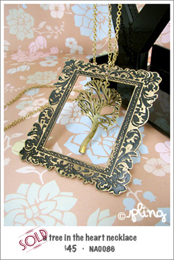 Dangling right in the centre of a big ornate frame is a tree. Inspired by the readings from Kim Edwards’ The Memory Keeper’s Daughter, one can conjure up how similar a tree is to the arteries & veins lining the heart. Celebrate life! Wear this sizable piece below your chest and play juxtaposition.
