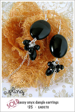 A flat, smooth, black onyx gives these earrings its classic, sassy look. Multiple smaller semiprecious onyx stones dance below it and amidst dainty 925 silver chains. Easy to wear, it’s great for complementing your sparkling eyes.