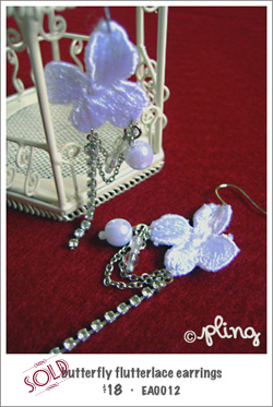 A lace shaped like a butterfly fluttering among flowers takes centerstage in this pair of earrings. A long diamante chain dangles at its base with silver chain interlooping to connect with a cluster of white pearl and clear seed beads, giving a seductive movement to this piece. Perfect when worn with a simple tube top or camisole.