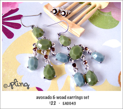 These softened, grey-off tones are perfect for those with a simple, composed demeanor. In soft woad blue and avocado green, these mini chandelier drop earrings are little black dress approved and simple white top endorsed. To add sparkle, a pair of simple purple studs arrives with this pair.