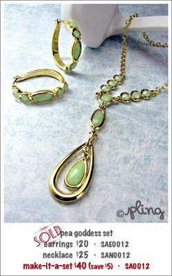 *SOLD* In a lively pea green hue, these Y-shaped necklace and hoop earrings reminds me of a Greek goddess in a white flowy silk gown and donning this set of jewelry. In present day, its simple classic design makes for a confident demeanor as you battle the day’s challenges.