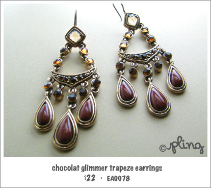 These elegant chandelier earrings are filled with timeless beauty. Beginning with twinkling caffe latte color faceted crystal, twin chains dusted with mandarin color crystals flow down to carry triple chocolat teardrops. Glimmering oh-so-subtly, these are perfect for ladies of summer skin tones.
