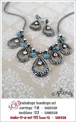 Like raindrops falling from a morning blue sky, these teardrop earrings and choker necklace sparkle and tease your eyes with reflecting light rays. Its dark grey diamantes and turquoise hexagons makes this earrings-choker set dressy enough for a date, without being overpowering. Pair with a tube dress for maximum effect.