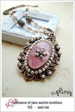 *SOLD* With its smooth pearls and its aged ornate bronze colored frame, this necklace looks like it came right out of one of Jane Austen’s novels. One can just imagine the heroine (and in my imagination, Lizzy in Pride And Prejudice) donning this necklace with her lively demeanor and flowy dresses. Like sweet icing on a pink cupcake, it’s a necklace that dreams of expectant love and romantic escapades.