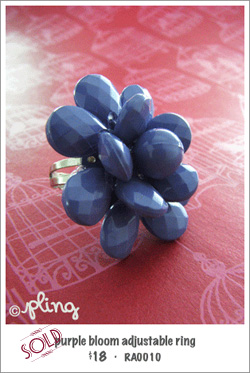 Crafted from teardrop faceted flat beads and painted purple, this bloom ring of a creamy yam color is so fun to wear! Bold and unusual, you can match it with colors of pastels, violets or blues.