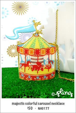 Flags flutter and trumpets sound. The carnival is here and they are setting up the carousel! Isn’t it lovely? There’s something nostalgically romantic about these merry-go-rounds that tug at the hearts of the child in all of us. This necklace is a statement piece with its sizable colorful carousel pendant that belongs to the nostalgic whimsy feel – romantic, with a story, vintage toy look. Goes well with solid color dress/top. I wore mine with a bright blue knee-length dress and never looked back.