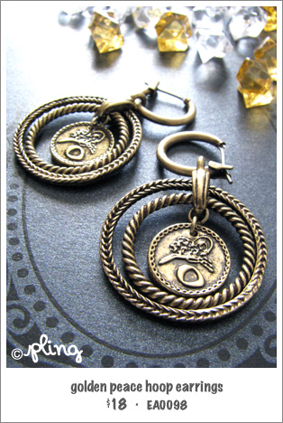 Fit for a Greek princess swathed in flowy drapes, these pair of hoop earrings descends to 2 dangling antiqued gold circles that are so reminiscent of the textured disc bands from ancient Greece. At the center of the dual hoops is a antiqued gold coin of a peace dove resting on a sprig of olive, offering peace. If you love to mix time-honored beauty with modern classic, these are the earrings to go for.