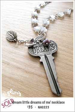 Inspired by the song, “Dream A Little Dream of Me”, this necklace pays tribute to love and in particular, dreams. Dreams give us hope, something to hold on to in this life, something or someone to love fervently and find a sweet happiness in. Handcrafted from Mother of Pearl star beads, this necklace features a ‘Dreams’ antiqued silver key with a Czech lavender flower bead and a rhodium mini dove. Wear it close and remind yourself that you have dreams, no matter what age you are or what place you might be in now.