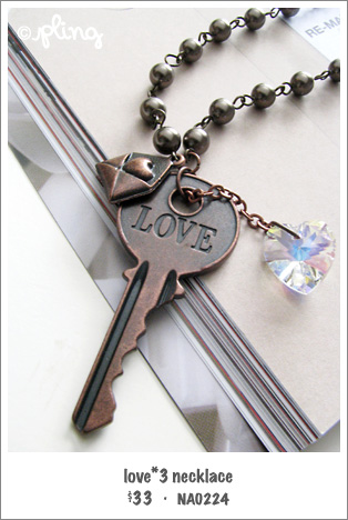 A love letter. The key to your house. A twinkling heart. These things remind me of love…amplified here by 3. Embrace love before it gets one by. Say love before it’s too late. Made with Swarovski dark olive pearls and a single Swarovski heart crystal, this handmade necklace celebrates love in its own subtle but dazzling way.