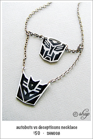 Inspired by the Transformers movies and the cartoons of childhood days, this necklace shows the symbols for Autobots and Decepticons. It’s ‘More than meet the eye!’ time!