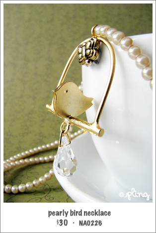 Small champagne gold pearls are individually handstrung to make this sweet romantic necklace where a little bird rests on its perch, from which a Swarovski teardrop crystal dangles teasingly. Its matt gold color, combined with champagne gold, transports one to the soft romantic hues of Paris in the Romantic era. A little butterfly joins in this admiration of feminine beauty.