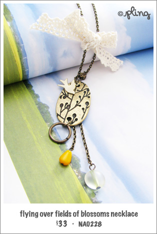 Inspired by the countryside, where grassy fields sprinkled with little wild flowers seem to stretch and meet the skies, this necklace features an antiqued gold, blossom-etched pendant with a matt gold bird silhouette hovering above it. A cotton lace ribbon adds that sweet idyllic-ness with a mini rose charm in company and summery beads dangling right below.