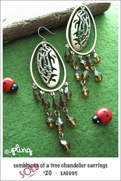 Like dewdrops drying themselves on the tree branches, these chandelier earrings sparkle with just the right amount of gleam. Blue diamantes glimmer against a matt gold tree branch silhouette while 5 drops in earth brown dangle and sway with the wind.