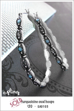 These oval hoops are big, yet subtle with its sublime black diamantes and striking turquoise stones. Great when paired with an exotic getup or a bohemian dress.