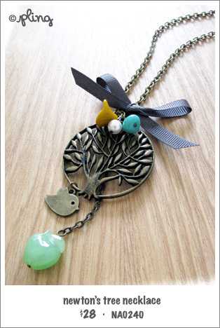 The apple is falling! Made of semiprecious lime green quartz, this apple falls from an antiqued gold tree pendant where shapely leaves sprout. A little feathered friend flies by and marvels at the ingenious thought of Sir Issac Newton, where he devised his system of gravitation through an apple falling from a tree. A mustard yellow poppy bead, Swarovski white pearl and turquoise blue bead add to the autumny imagery that this necklace exudes.