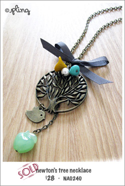 The apple is falling! Made of semiprecious lime green quartz, this apple falls from an antiqued gold tree pendant where shapely leaves sprout. A little feathered friend flies by and marvels at the ingenious thought of Sir Issac Newton, where he devised his system of gravitation through an apple falling from a tree. A mustard yellow poppy bead, Swarovski white pearl and turquoise blue bead add to the autumny imagery that this necklace exudes.