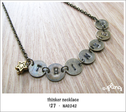Right above my desk lies a magnet copy of Van Gogh’s Starry Night, one of my favorite painting. I wondered what he was thinking and feeling when he was painting this. Seeing this painting was probably the start of my obsession with stars. Gazing at the clear starry sky, I often wondered if there were friendly alien life in other planets and even stars. Then, my mind soon wanders and I start to think about other things, which usually end in praying about these thoughts. A tribute to the thinker in intelligent life, this necklace features individually hand-stamped vintage brass disc, linked to form the word ‘THINKER’. Of course, a mini gold star charm accompanies it.