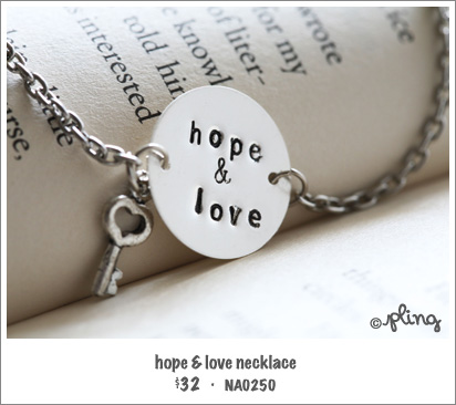 Hand-stamped on a silver-plated disc in an unassuming lowercase font, the words ‘hope & love’ sum up what’s important in our lives – to have hope, to give hope and love one another. This necklace sports a love mini key, seemingly to convey that as long as we have hope & key, we would have the key to having a good life.