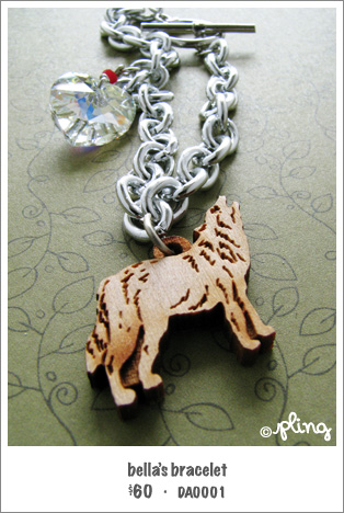 Inspired by the Twilight series, and based on the bracelet in Eclipse, the 3rd book in the series by Stephenie Meyer, this Bella’s bracelet follows closely to the picture and description in the novel. The Swarovski crystal heart is a symbol of Edward, casting glitters of psychedelic light on the walls. The wooden wolf, specially hand-carved by an artisans I managed to locate, is a symbol of Jacob and beautifully made from brown wood.
