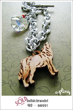 Inspired by the Twilight series, and based on the bracelet in Eclipse, the 3rd book in the series by Stephenie Meyer, this Bella’s bracelet follows closely to the picture and description in the novel. The Swarovski crystal heart is a symbol of Edward, casting glitters of psychedelic light on the walls. The wooden wolf, specially hand-carved by an artisans I managed to locate, is a symbol of Jacob and beautifully made from brown wood.