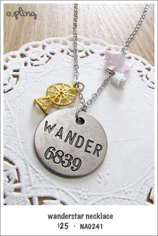 Let’s wander off! Get on a ferris wheel and admire the stars twinkling above, taking in the beauty of the indigo night. Remember to take in the neonlights of the city below, which forms another blanket of stars as if you are floating in a starry sea. Made with these images in mind, this necklace features an aged silver pendant with “wander” inscription, a mini merry-go-round charm and 2 semiprecious stars made of rosy cat’s eye and white pearl hanging on the chain.