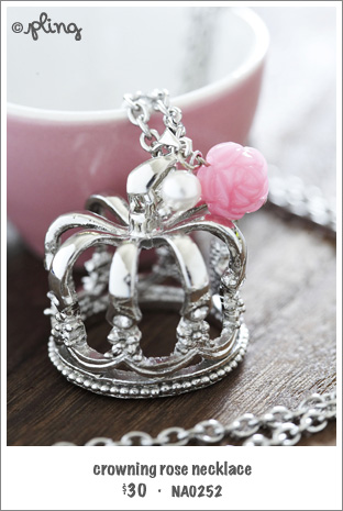 This long necklace is inspired by the Chateau de Versailles, a castle I visited in Paris, where I saw the chambers of Queen Marie Antoniette, my closest encounter with a queen. I love the little chateau that she had where there was a quaint, beautiful village filled with gardens of flowers and vegetables, that she built to get away from court life and her little rose-draped chamber. A 3D hefty silver crown forms the main highlight of this necklace. A little dusty pink rose bead and a smooth Swarovski white pearl sit on top of the crown, adding luster and color to the necklace.