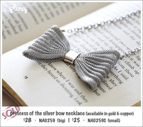 A simple bow, made from tightly woven mesh of metal, hangs beautifully from this necklace. Spelling city chic, its ease and simplicity makes it suitable for a nice day out with the girls, or a sweet dinner date. Perfect for jumbling boyish chic with princess charm, adding vintage loveliness to party glam or making a statement with its austerity.