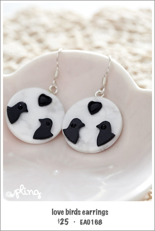 For love birds. The heart hovering above the 2 birds are made of semiprecious black onyx. The background? White howlite that looks very much like white marble. This pair of earrings hangs from 925 silver ear hooks.