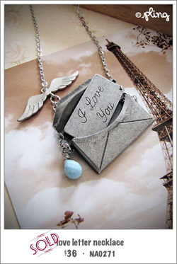 Traveling miles, the silver envelope is aged but still has its letter intact. Spelling ‘I Love You’, the letter can be taken out safely as it is secured to the necklace. After reading it, you can keep it safe and snap the envelope close again. Wear it close and feel a sweet warmth welling up in your heart. Love is a wonderful feeling!
