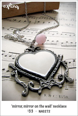 A mirror is within reach with this romantic and whimsical necklace, framed with a vintage-style border. Its heart shape reminds you to shower all your dear ones with love, and not forgetting to love yourself too! Donned with a butterfly filigree and a charming rose bead, it is a necklace that not only tells a fairytale, but is also handy in your everyday life. Old romanticism is never reflected better!