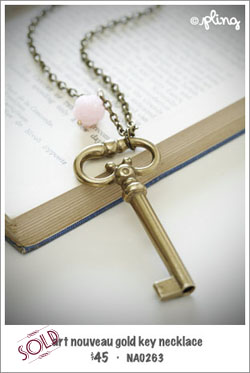 Imported from Paris, this art nouveau key is an actual furniture key for those beautifully crafted cabinets at the turn of the 20th century. With a substantial weight, it’s not of a shoddy make. Adorned with a lovely dusty pink rose bead, this necklace would add some romantic fantasy to your day out.
