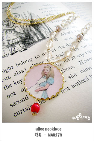 Inspired by Lewis Carroll’s ingenious imagination and storytelling in Alice In Wonderland, this whimsical romantic necklace features Alice in her becoming pinafore dress against a flattering pink background. A striking red bead hangs from the pendant while the chain is partly and prettily made of dusty pink Swarovski pearls and clear pale pink beads.