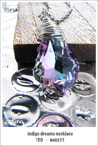 The myriad of colors in this ornately cut Swarovski crystal really intrigues me and reminds me of the aurora (which is a dream to witness one day). With every turn against the light, I delight the lovely change of hues from indigo to mauve, and from robin’s egg blue to teal. And one can’t put a finger to its extra tint. Beautiful in itself and freely wrapped with silver wire, this is a unique necklace that will match easily with many of the pieces in your wardrobe.