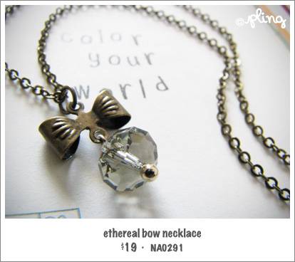 A smoky Swarovski crystal, hanging from a vintaged gold ribbon bow, rests beautifully on your collarbones and adds a little sparkle to your day.